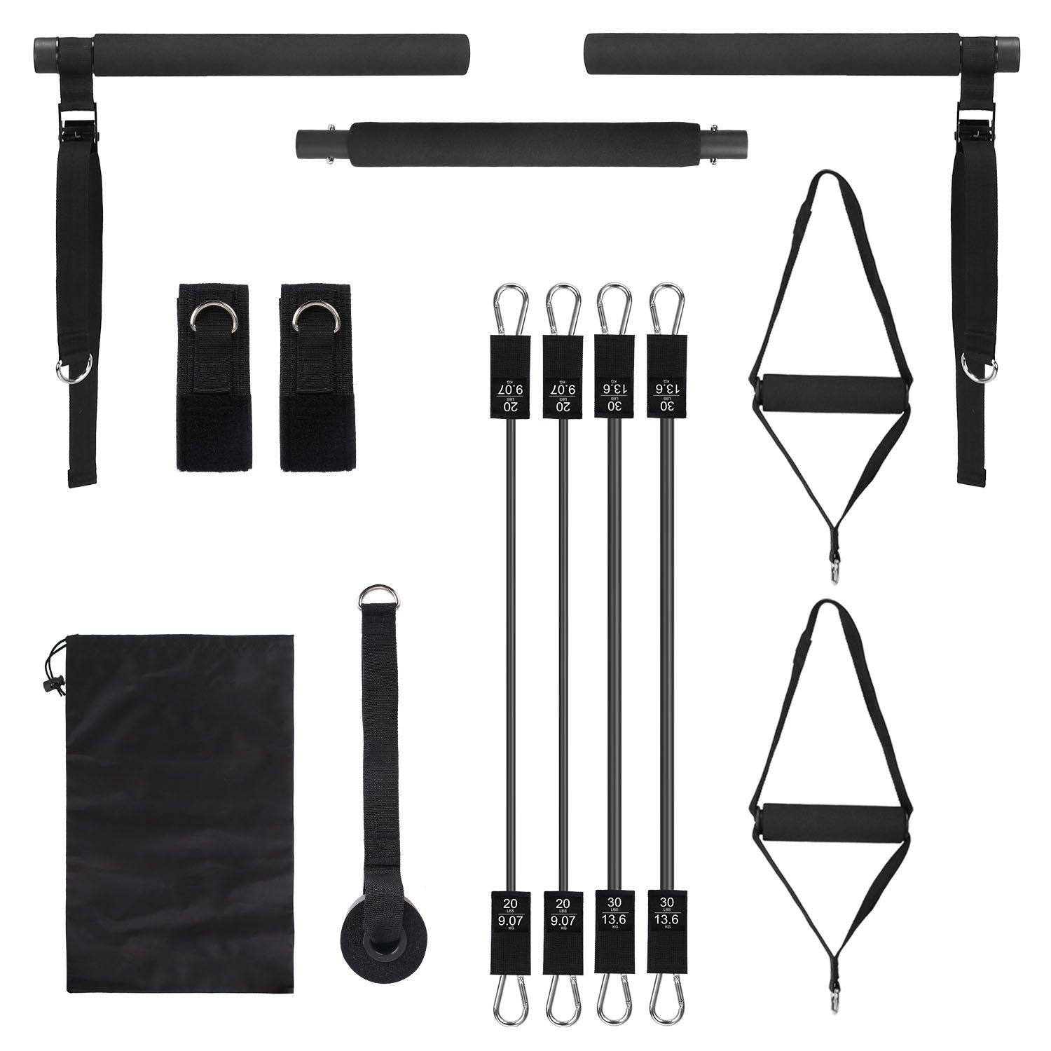 1.Equipped with workout stick, resistance bands, handle & foot straps, ankle straps and door anchor