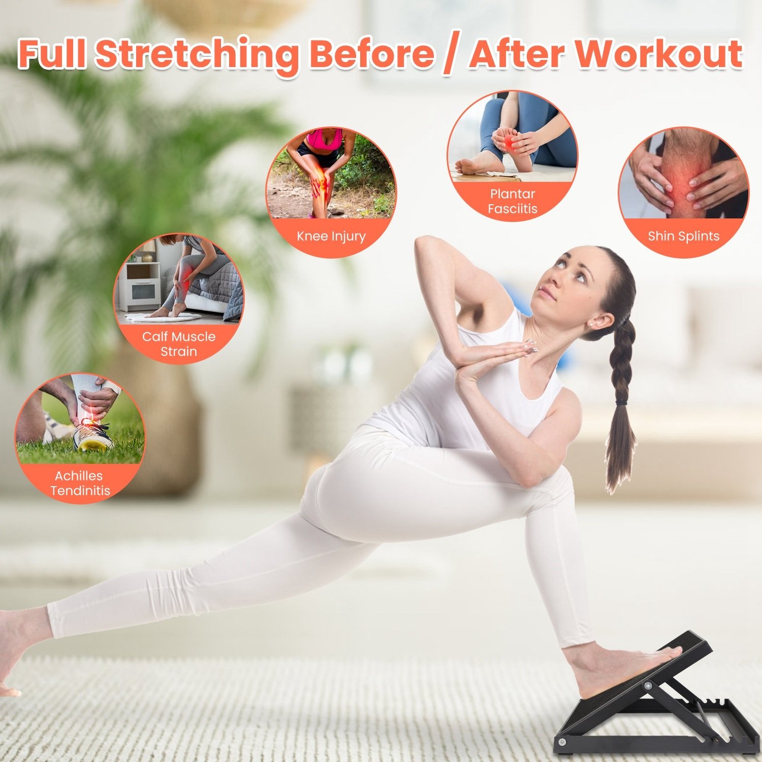 *Full Leg Stretch*:Our professional stretching slant board is especially designed for giving your leg a full and proper stretch before and after workout,like hamstring,muscle,knee,tendon,plantar fascia and so on. Besides,this calf stretcher is also a practical assistant to help you recover from shin splints,calf strains,foot and ankle injuries,plantar fasciitis,overuse syndromes.